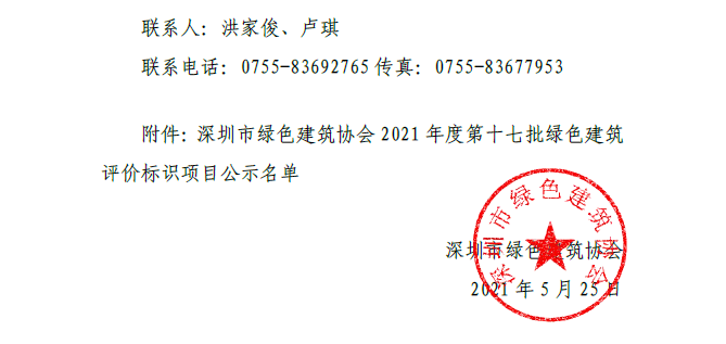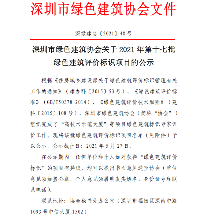 深圳市綠色建筑協(xié)會關(guān)于2021年第十七批綠色建筑評價標(biāo)識項目的公示