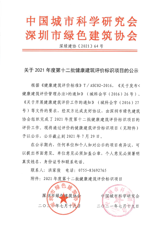 關(guān)于2021年度第十二批健康建筑評價標(biāo)識項目的公示