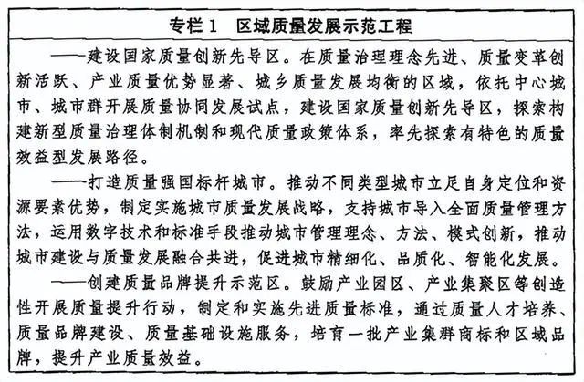 (九)打造區(qū)域質(zhì)量發(fā)展新優(yōu)勢。加強(qiáng)質(zhì)量政策引導(dǎo),推動區(qū)域質(zhì)量發(fā)展與生產(chǎn)力布局、區(qū)位優(yōu)勢、環(huán)境承載能力及社會發(fā)展需求對接融合。推動?xùn)|部地區(qū)發(fā)揮質(zhì)量變革創(chuàng)新的引領(lǐng)帶動作用,增強(qiáng)質(zhì)量競爭新優(yōu)勢,實現(xiàn)整體質(zhì)量提升。引導(dǎo)中西部地區(qū)因地制宜發(fā)展特色產(chǎn)業(yè),促進(jìn)區(qū)域內(nèi)支柱產(chǎn)業(yè)質(zhì)量升級,培育形成質(zhì)量發(fā)展比較優(yōu)勢。推動?xùn)|北地區(qū)優(yōu)化質(zhì)量發(fā)展環(huán)境,加快新舊動能轉(zhuǎn)換,促進(jìn)產(chǎn)業(yè)改造升級和質(zhì)量振興。健全區(qū)域質(zhì)量合作互助機(jī)制,推動區(qū)域質(zhì)量協(xié)同發(fā)展。深化質(zhì)量強(qiáng)省建設(shè),推動質(zhì)量強(qiáng)市、質(zhì)量強(qiáng)業(yè)向縱深發(fā)展,打造質(zhì)量強(qiáng)國建設(shè)標(biāo)桿。