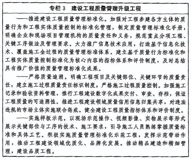 (十五)打造中國建造升級版。堅持百年大計、質(zhì)量第一,樹立全生命周期建設(shè)發(fā)展理念,構(gòu)建現(xiàn)代工程建設(shè)質(zhì)量管理體系,打造中國建造品牌。完善勘察、設(shè)計、監(jiān)理、造價等工程咨詢服務(wù)技術(shù)標(biāo)準(zhǔn),鼓勵發(fā)展全過程工程咨詢和專業(yè)化服務(wù)。完善工程設(shè)計方案審查論證機(jī)制,突出地域特征、民族特點(diǎn)、時代風(fēng)貌,提供質(zhì)量優(yōu)良、安全耐久、環(huán)境協(xié)調(diào)、社會認(rèn)可的工程設(shè)計產(chǎn)品。加大先進(jìn)建造技術(shù)前瞻性研究力度和研發(fā)投入,加快建筑信息模型等數(shù)字化技術(shù)研發(fā)和集成應(yīng)用,創(chuàng)新開展工程建設(shè)工法研發(fā)、評審、推廣。加強(qiáng)先進(jìn)質(zhì)量管理模式和方法高水平應(yīng)用,打造品質(zhì)工程標(biāo)桿。推廣先進(jìn)建造設(shè)備和智能建造方式,提升建設(shè)工程的質(zhì)量和安全性能。大力發(fā)展綠色建筑,深入推進(jìn)可再生能源、資源建筑應(yīng)用,實現(xiàn)工程建設(shè)全過程低碳環(huán)保、節(jié)能減排。
