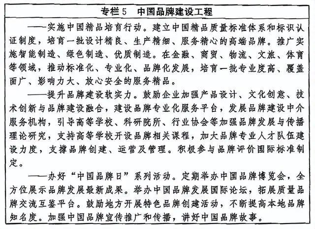 (二十一)爭創(chuàng)國內(nèi)國際知名品牌。完善品牌培育發(fā)展機(jī)制,開展中國品牌創(chuàng)建行動,打造中國精品和“百年老店”。鼓勵企業(yè)實施質(zhì)量品牌戰(zhàn)略,建立品牌培育管理體系,深化品牌設(shè)計、市場推廣、品牌維護(hù)等能力建設(shè),提高品牌全生命周期管理運(yùn)營能力。開展品牌理論、價值評價研究,完善品牌價值評價標(biāo)準(zhǔn),推動品牌價值評價和結(jié)果應(yīng)用。統(tǒng)籌開展中華老字號和地方老字號認(rèn)定,完善老字號名錄體系。持續(xù)辦好“中國品牌日”系列活動。支持企業(yè)加強(qiáng)品牌保護(hù)和維權(quán),依法嚴(yán)厲打擊品牌仿冒、商標(biāo)侵權(quán)等違法行為,為優(yōu)質(zhì)品牌企業(yè)發(fā)展創(chuàng)造良好環(huán)境。