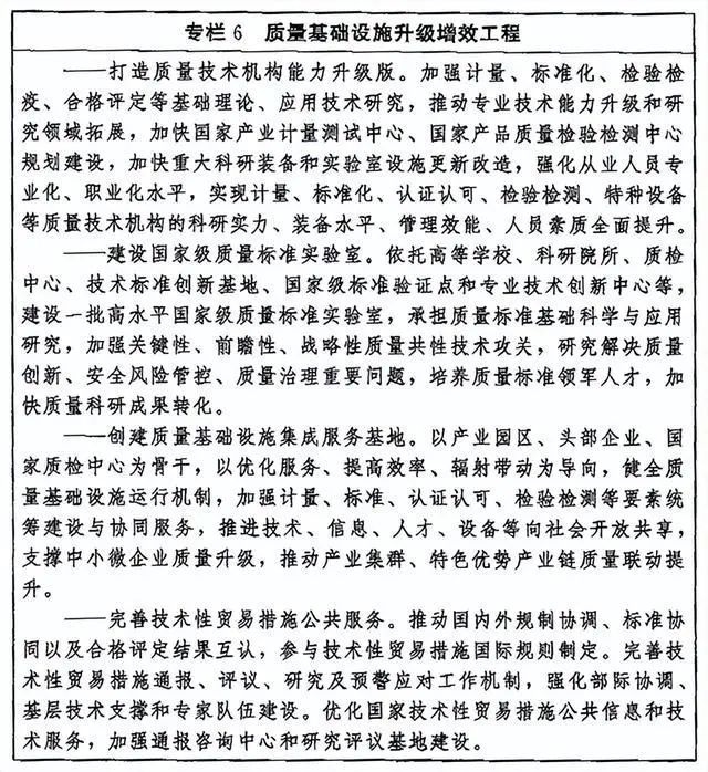 (二十三)加強(qiáng)質(zhì)量基礎(chǔ)設(shè)施能力建設(shè)。合理布局國家、區(qū)域、產(chǎn)業(yè)質(zhì)量技術(shù)服務(wù)機(jī)構(gòu),建設(shè)系統(tǒng)完備、結(jié)構(gòu)優(yōu)化、高效實用的質(zhì)量基礎(chǔ)設(shè)施。實施質(zhì)量基礎(chǔ)設(shè)施能力提升行動,突破量子化計量及扁平化量值傳遞關(guān)鍵技術(shù),構(gòu)建標(biāo)準(zhǔn)數(shù)字化平臺,發(fā)展新型標(biāo)準(zhǔn)化服務(wù)工具和模式,加強(qiáng)檢驗檢測技術(shù)與裝備研發(fā),加快認(rèn)證認(rèn)可技術(shù)研究由單一要素向系統(tǒng)性、集成化方向發(fā)展。加快建設(shè)國家級質(zhì)量標(biāo)準(zhǔn)實驗室,開展先進(jìn)質(zhì)量標(biāo)準(zhǔn)、檢驗檢測方法、高端計量儀器、檢驗檢測設(shè)備設(shè)施的研制驗證。完善檢驗檢測認(rèn)證行業(yè)品牌培育、發(fā)展、保護(hù)機(jī)制,推動形成檢驗檢測認(rèn)證知名品牌。加大質(zhì)量基礎(chǔ)設(shè)施能力建設(shè),逐步增加計量檢定校準(zhǔn)、標(biāo)準(zhǔn)研制與實施、檢驗檢測認(rèn)證等無形資產(chǎn)投資,鼓勵社會各方共同參與質(zhì)量基礎(chǔ)設(shè)施建設(shè)。