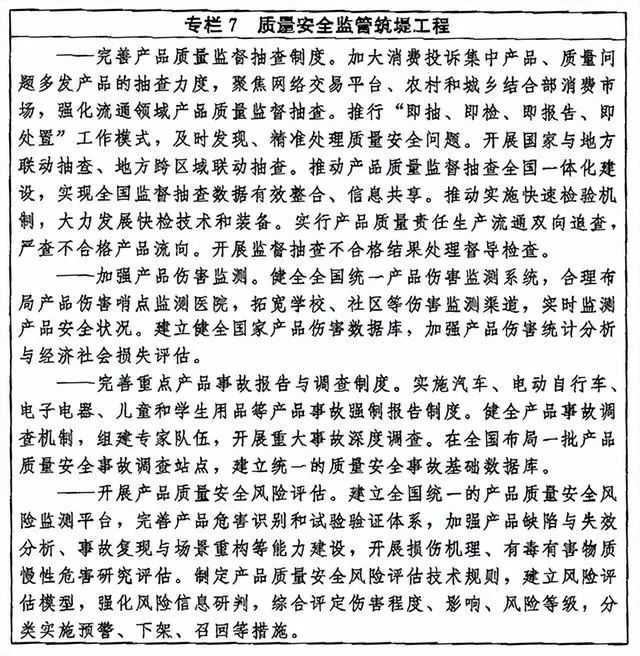 (二十七)優(yōu)化質(zhì)量監(jiān)管效能。健全以“雙隨機(jī)、一公開”監(jiān)管和“互聯(lián)網(wǎng)+監(jiān)管”為基本手段、以重點(diǎn)監(jiān)管為補(bǔ)充、以信用監(jiān)管為基礎(chǔ)的新型監(jiān)管機(jī)制。創(chuàng)新質(zhì)量監(jiān)管方式,完善市場準(zhǔn)入制度,深化工業(yè)產(chǎn)品生產(chǎn)許可證和強(qiáng)制性認(rèn)證制度改革,分類放寬一般工業(yè)產(chǎn)品和服務(wù)業(yè)準(zhǔn)入限制,強(qiáng)化事前事中事后全鏈條監(jiān)管。對涉及人民群眾身體健康和生命財產(chǎn)安全、公共安全、生態(tài)環(huán)境安全的產(chǎn)品以及重點(diǎn)服務(wù)領(lǐng)域,依法實施嚴(yán)格監(jiān)管。完善產(chǎn)品質(zhì)量監(jiān)督抽查制度,加強(qiáng)工業(yè)品和消費(fèi)品質(zhì)量監(jiān)督檢查,推動實現(xiàn)生產(chǎn)流通、線上線下一體化抽查,探索建立全國聯(lián)動抽查機(jī)制,對重點(diǎn)產(chǎn)品實施全國企業(yè)抽查全覆蓋,強(qiáng)化監(jiān)督抽查結(jié)果處理。建立健全產(chǎn)品質(zhì)量安全風(fēng)險監(jiān)控機(jī)制,完善產(chǎn)品傷害監(jiān)測體系,開展質(zhì)量安全風(fēng)險識別、評估和處置。建立健全產(chǎn)品質(zhì)量安全事故強(qiáng)制報告制度,開展重大質(zhì)量安全事故調(diào)查與處理。健全產(chǎn)品召回管理體制機(jī)制,加強(qiáng)召回技術(shù)支撐,強(qiáng)化缺陷產(chǎn)品召回管理。構(gòu)建重點(diǎn)產(chǎn)品質(zhì)量安全追溯體系,完善質(zhì)量安全追溯標(biāo)準(zhǔn),加強(qiáng)數(shù)據(jù)開放共享,形成來源可查、去向可追、責(zé)任可究的質(zhì)量安全追溯鏈條。加強(qiáng)產(chǎn)品防偽監(jiān)督管理。建立質(zhì)量安全“沙盒監(jiān)管”制度,為新產(chǎn)品新業(yè)態(tài)發(fā)展提供容錯糾錯空間。加強(qiáng)市場秩序綜合治理,營造公平競爭的市場環(huán)境,促進(jìn)質(zhì)量競爭、優(yōu)勝劣汰。嚴(yán)格進(jìn)出口商品質(zhì)量安全檢驗監(jiān)管,持續(xù)完善進(jìn)出口商品質(zhì)量安全風(fēng)險預(yù)警和快速反應(yīng)監(jiān)管機(jī)制。加大對城鄉(xiāng)結(jié)合部、農(nóng)村等重點(diǎn)區(qū)域假冒偽劣的打擊力度。強(qiáng)化網(wǎng)絡(luò)平臺銷售商品質(zhì)量監(jiān)管,健全跨地區(qū)跨行業(yè)監(jiān)管協(xié)調(diào)聯(lián)動機(jī)制,推進(jìn)線上線下一體化監(jiān)管。