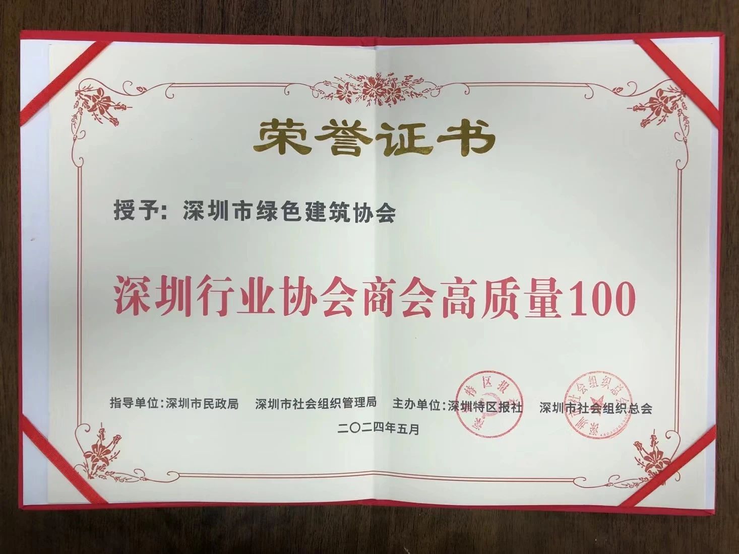 深圳市綠色建筑協(xié)會黨支部書記、秘書長王向昱(左三)領(lǐng)取 “深圳行業(yè)協(xié)會商會高質(zhì)量100”牌匾和證書