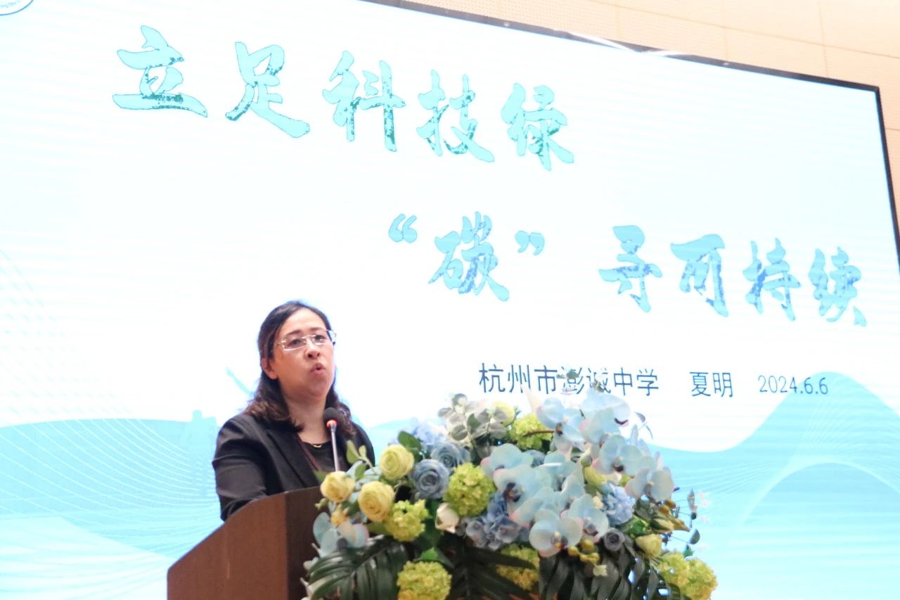 澎誠(chéng)中學(xué)夏明校長(zhǎng)以《立足科技綠,‘碳’路可持續(xù)》為主題做了專題發(fā)言。她分享了校園中綠色建筑的設(shè)計(jì)理念和零碳課程的設(shè)計(jì)思路,以及學(xué)校在生態(tài)文明教育方面的積極探索和實(shí)踐成果。夏校長(zhǎng)強(qiáng)調(diào),澎誠(chéng)中學(xué)一直以來(lái)都高度重視綠色教育,致力于培養(yǎng)學(xué)生的環(huán)保意識(shí)和實(shí)踐能力,讓學(xué)生成為零碳路上的先行者。