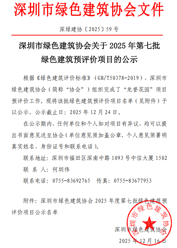 深圳市綠色建筑協(xié)會(huì)關(guān)于2025年第七批綠色建筑預(yù)評(píng)價(jià)項(xiàng)目的公示