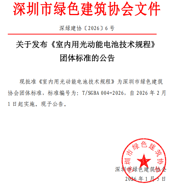 關(guān)于發(fā)布《室內(nèi)用光動(dòng)能電池技術(shù)規(guī)程》團(tuán)體標(biāo)準(zhǔn)的公告