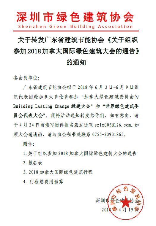 關(guān)于轉(zhuǎn)發(fā)廣東省建筑節(jié)能協(xié)會《關(guān)于組織參加2018加拿大國際綠色建筑大會的通告》的通知