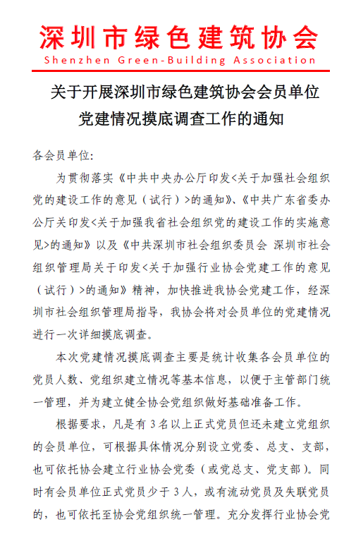 關(guān)于開展深圳市綠色建筑協(xié)會(huì)會(huì)員單位黨建情況摸底調(diào)查工作的通知