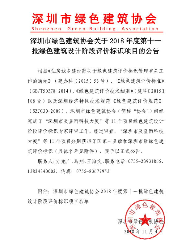 深圳市綠色建筑協(xié)會關于2018年度第十一批綠色建筑設計階段評價標識項目的公告