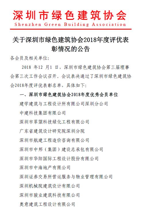 關(guān)于深圳市綠色建筑協(xié)會2018年度評優(yōu)表彰情況的公告