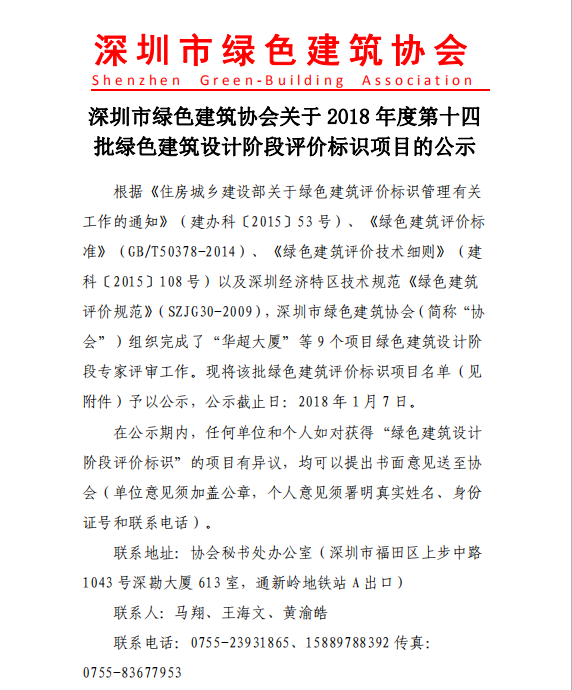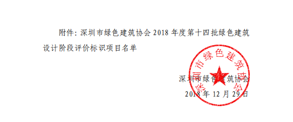 深圳市綠色建筑協(xié)會關于2018年度第十四批綠色建筑評價標識項目的公示
