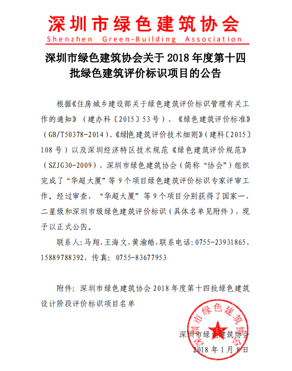 深圳市綠色建筑協(xié)會關于2018年度第十四批綠色建筑評價標識項目的公告