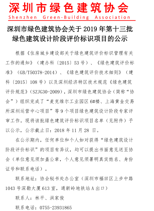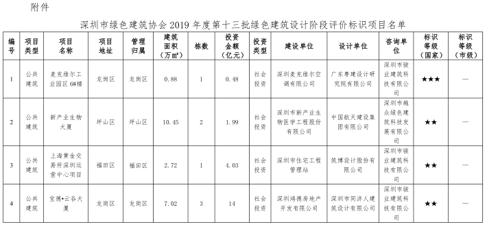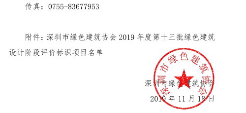 深圳市綠色建筑協(xié)會關(guān)于2019年度第十三批綠色建筑設(shè)計階段評價標(biāo)識項目的公示