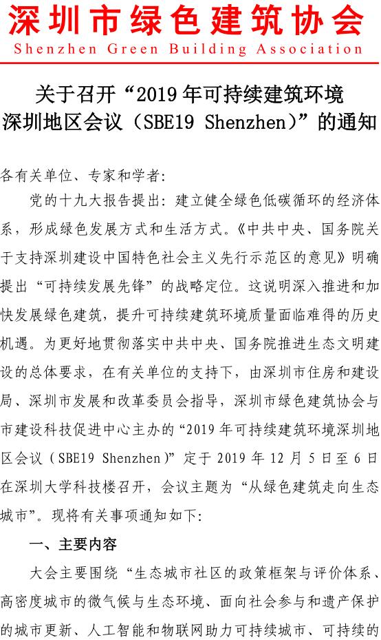 【三號(hào)通知】關(guān)于召開“2019年可持續(xù)建筑環(huán)境深圳地區(qū)會(huì)議(SBE19 Shenzhen)”的通知