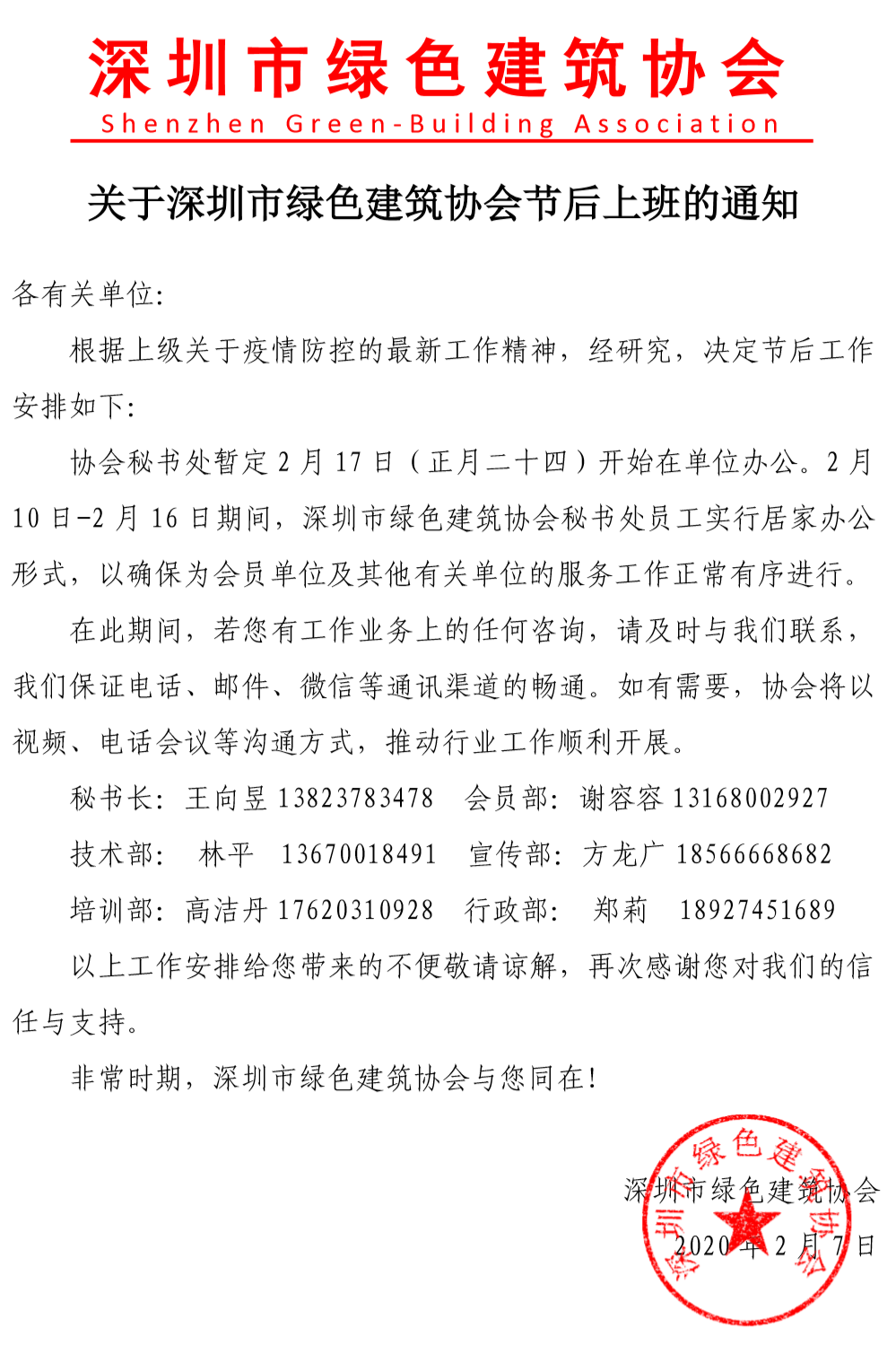 關(guān)于深圳市綠色建筑協(xié)會(huì)節(jié)后上班的通知